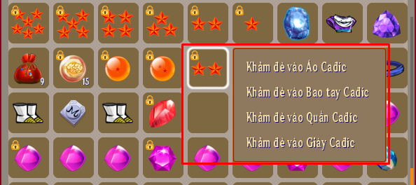 * Thao tác khảm: chọn vào ngọc khảm -> chọn khảm đè -> chọn trang bị -> chọn dòng muốn khảm đè.